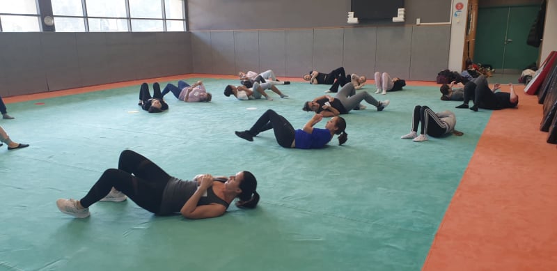 Fabien nous a proposé un travail spécifique en relation avec notre discipline notamment par une phase d'échauffement activo-dynamique, suivi de plusieurs circuits (exercices en pliométrie, abdos complets, gainage) et un retour au calme par du stretching (postural, relaxation, travail sur la respiration).