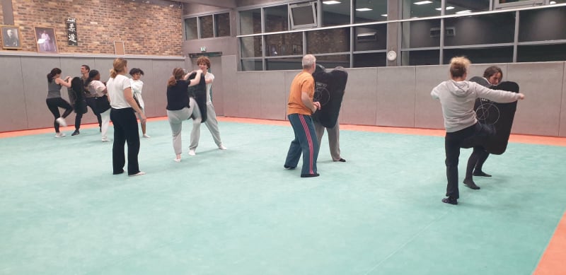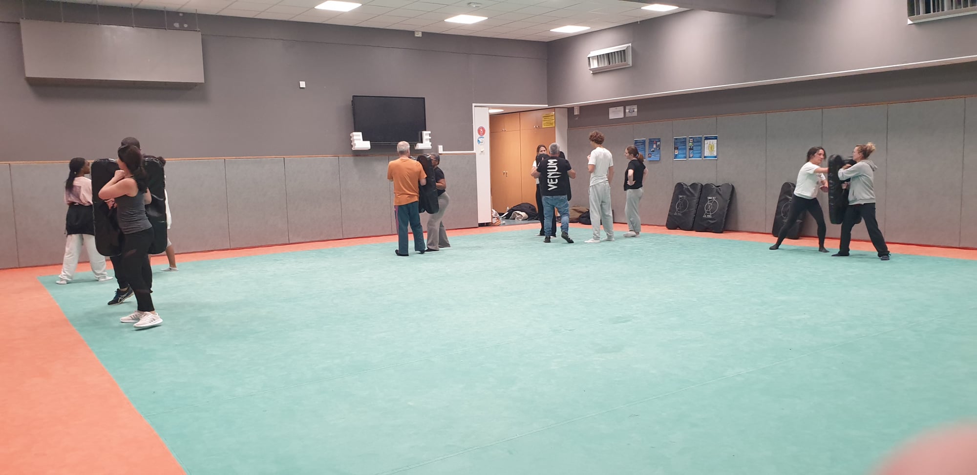 Les pratiquants du club, plus motivés que jamais, ont répondu présents en nombre pour ce cours spécifique orienté cardio, percussions, pieds-poings, défense sur coups de poing, défense sur bâton, arme improvisée avec un stylo.