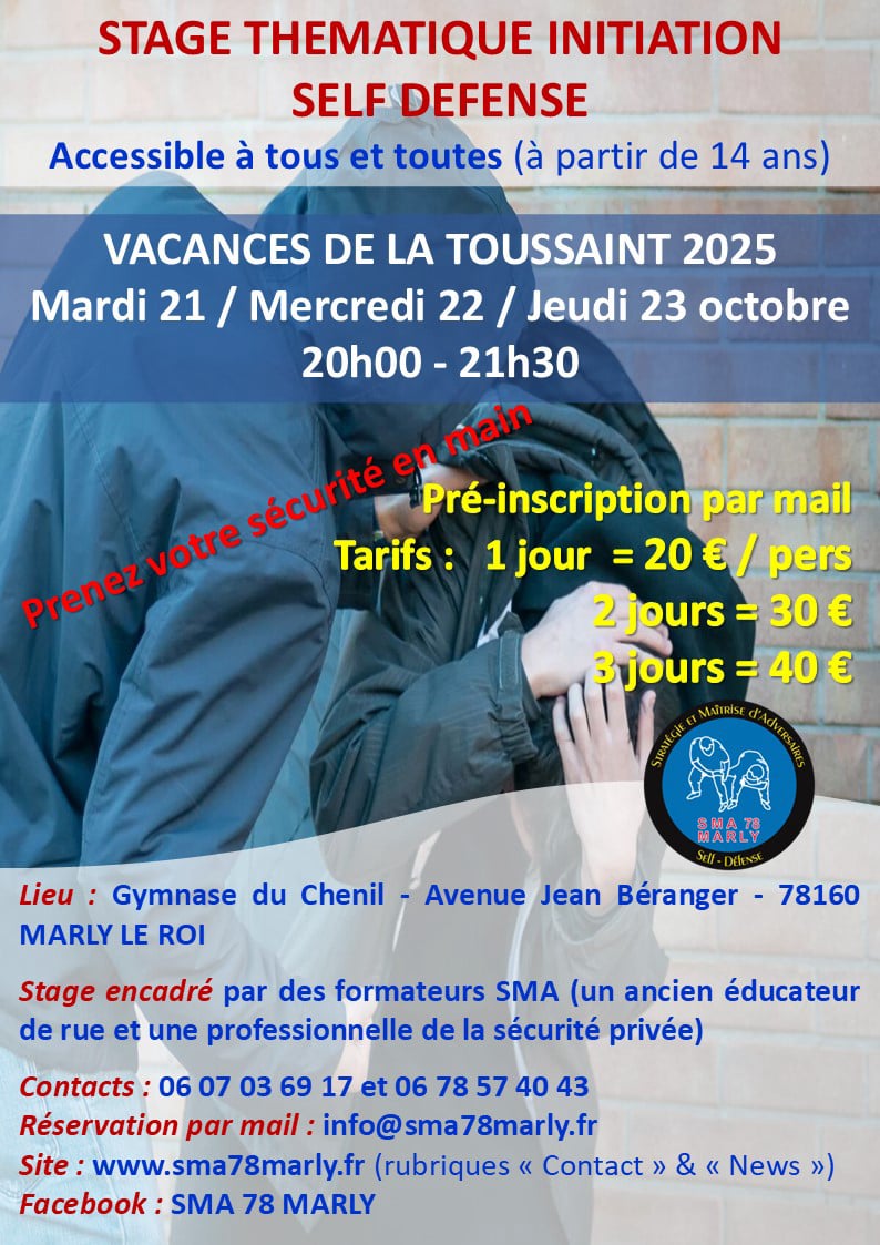Le club SMA 78 MARLY a organisé 3 soirs de stage thématique initiation self-defense pendant les vacances de la Toussaint 2024, les mardi 22, mercredi 23 et jeudi 24 octobre 2024, au gymnase du Chenil de Marly le Roi.